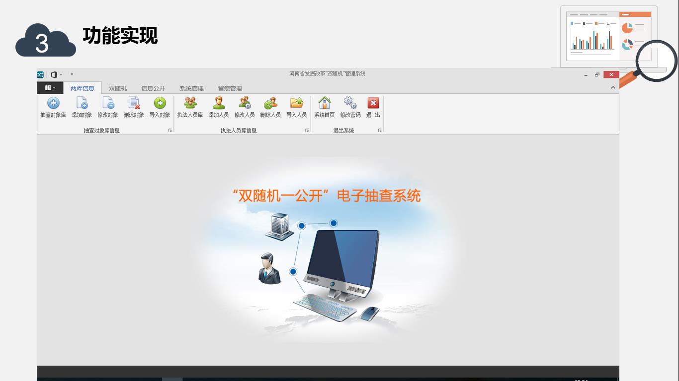 首先根據(jù)各種設定的抽取規(guī)則在檢查對象名錄庫中隨機抽取檢查對象,再從執(zhí)法人員中通過隨機的運算抽取出相對應的執(zhí)法人員,實現(xiàn)執(zhí)法檢查的公正、公平、透明。