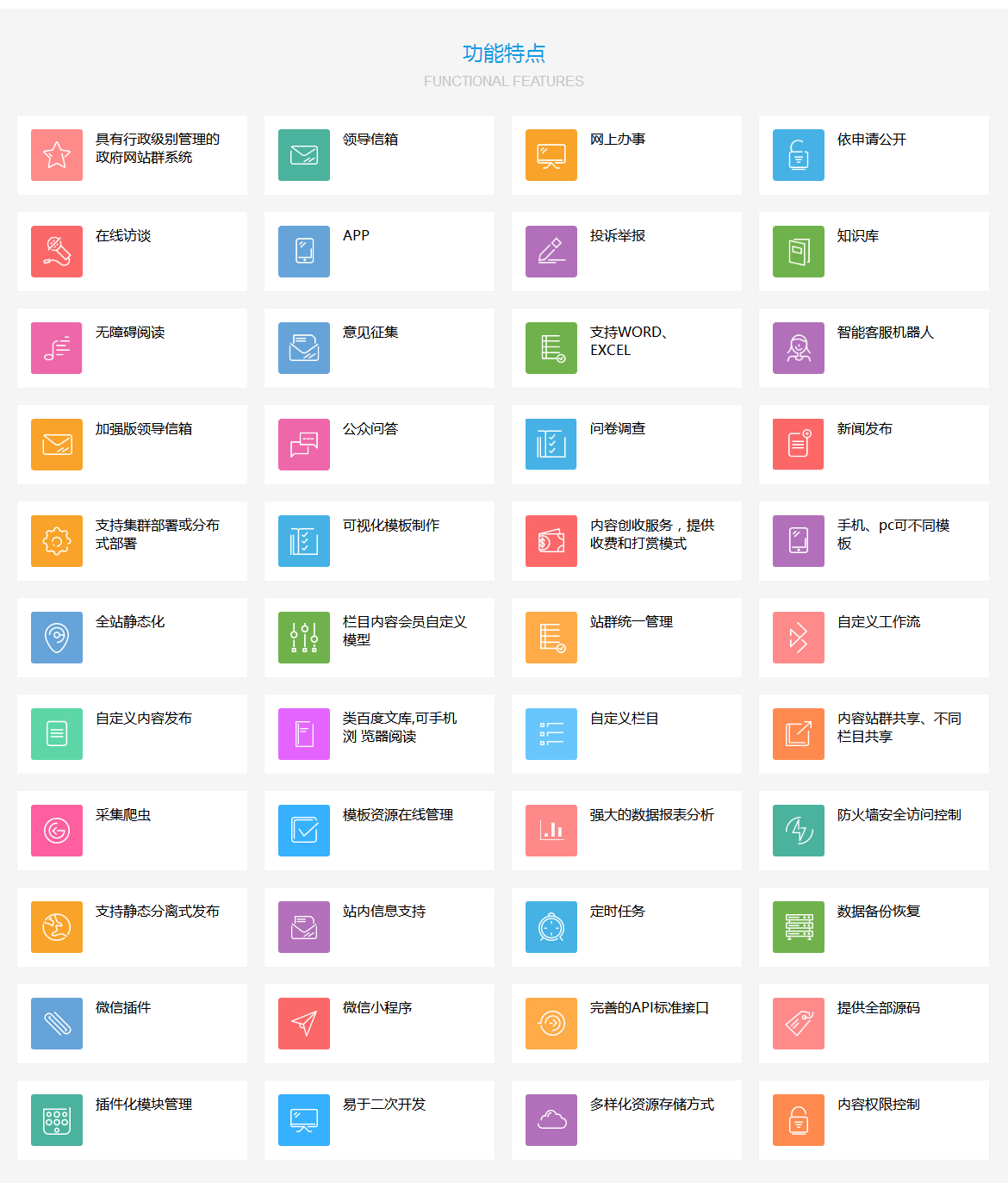 政府綜合業務管理平臺(以下簡稱GOVCMS)基于java技術、采用SpringMVC3+Spring3+Hibernate3+Freemarker技術架構自主研發政府綜合業務管理平臺,平臺涵蓋了目前政府門戶站群系統、政務公開系統、政民互動系統、在線辦事、無障礙閱讀系統、在線訪談系統等子系統,是一款集政府各部門協同辦公的綜合業務管理平臺系統。 ? 基于java技術開發,繼承其強大、穩定、安全、高效、跨平臺等多方面的優點,支持mysql、oracle、sqlserver、db2等數據庫 ? 提供最便利、合理的使用方式 ? 強大、靈活的標簽,用戶自定義顯示內容和顯示方式 ? 在設計上自身預先做了搜索引擎優化,增強對搜索引擎的友好性 ? 完全生成全站靜態頁面,可自定義路徑結構,全面提高頁面訪問速度 ? 輕松建設大規模網站,可通過次級域名建立子站群,各子站后臺管理權限分離,全站實現單點登錄政府綜合業務管理平臺(以下簡稱GOVCMS)基于java技術、采用SpringMVC3+Spring3+Hibernate3+Freemarker技術架構自主研發政府綜合業務管理平臺,平臺涵蓋了目前政府門戶站群系統、政務公開系統、政民互動系統、在線辦事、無障礙閱讀系統、在線訪談系統等子系統,是一款集政府各部門協同辦公的綜合業務管理平臺系統。